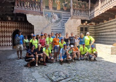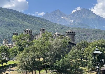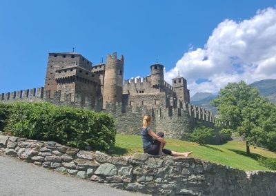 Dan pred odhodom, se del skupine odloči, da gre osvojiti bližnji dvatisočak, del skupine gre ponovno v mesto Aosta, preostali pa se odločimo, da si ogledamo grad Fénis. Grad se prvič pojavi v dokumentu iz leta 1242 kot last vikontov iz Aoste, družine Challant. V času gospostva Aymona iz Challanta in njegovega sina Bonifacija I. iz Challanta je grad dobil zunanje obzidje, številne stolpe, zunanje stopnišče, balkone na notranjem dvorišču, freske v notranji kapeli in notranjem dvorišču ter bogato dvorišče, obdano z zelenjavnim parkom, vinogradom in vrtom, kjer so se lahko gospod in njegovi gostje sproščali.