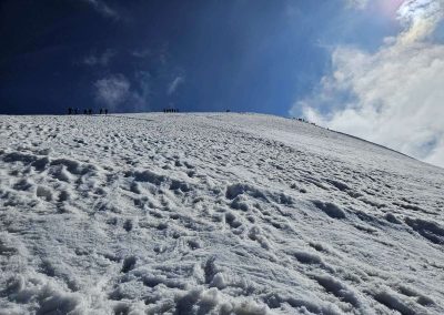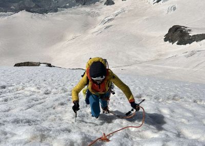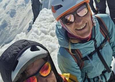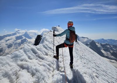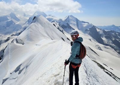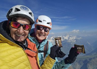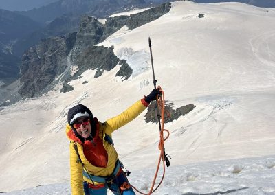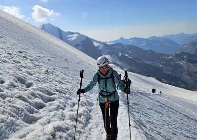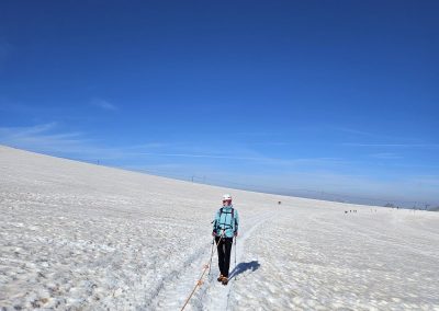 Ob 06.30 me pričaka pred hotelom in najin dan se začne. Vreme je čudovito, sončno in brez vetra. Po dobri uri sva na vznožju gore. Nadaneva si vso obvezno opremo, danes s pravimi derezami, in začneva z vzponom. Ker smo že na višini 3.885 n.m.v. na katero naju je popeljala najvišje vozeča gondola v Evropi, se najina hoja v navezi začne v stilu pole, pole. Vrv mora biti ravno prav napeta in nikoli se ne sme vleči po snegu. Vzpon ni tehnično zahteven. Previdnost je potrebna zaradi možnosti višinske bolezni. Korak steče in počutim se odlično. Nekje na polovici vzpona, jo prosim, če lahko greva pol korala hitreje. Z veliko mero previdnosti mi ustreže in po uri in sedemindvajset minut sva na vrhu Breithorna. Po obveznem fotografiranju, mi reče, da sva bili hitri in imava čas še za obisk centralnega Breithorna. Z malo dvoma se prepustim in stopiva naprej do novega cilja. Pot po grebenu je zelo ozka, kot bi hodila po vrvi, desno in levo pa je prepad. Spodbudi me, da naj pogledam naokoli, saj so od tu razgledi dih jemajoči. Kot bi stali na oblaku in je nebo najina meja. V meni je rahla napetost, saj se ne morem nikamor nasloniti, napačnega koraka pa si tudi ne smem privoščiti, a vseeno dvignem pogled in okoli mene zagledam zasnežene gore obsijane s soncem. Neprecenljivo. Na poti me Marija Štrempfelj pouči, da hoja po ledeniku terja precejšno previdnost tudi zaradi ledeniških razpok. Drugačna barva snega, valovita površina in “odtis stopinje prekrite s snežno kopreno” nakazuje, da hodiva v smeri ledeniških razpok. S precejšnjo mero koncentracije in previdnosti, kaj kmalu doseževa še drugi vrh. Tudi tu je čudovit razgled po mogočnem gorovju, a lepota zasneženih strmin ne dovoljuje sproščenega gibanja, saj je v neposredni bližini kloža. Srčni objem s palicami v mojih rokah povzroči nesrečo. Začne se reševalna akcija. Rešiti je potrebno mojo pohodno palico, ki mi je zletela po strmini navzdol. Z veliko radovednostjo opazujem in se učim. Kaj kmalu je reševalna akcija uspešno zaključena in nadaljujeva najino krožno pot k izhodišču. Zame najtežji del poti, saj sva morali do izhodišča prehoditi pot po ravnini razmočenega snega. “A sedaj boš pa jamrala,” me okrega Marija 🙂