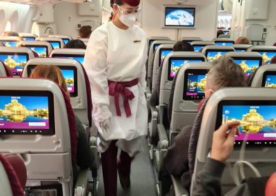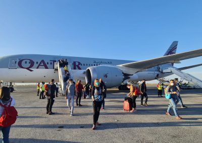 Ne morem mimo razmišljamja, da je obdobje korone tudi pozitivno obdobje. Čarobna beseda, ki smo jo na dan potovanja uporabljali je bila – tranzit. Potovanje je bilo prijetno saj ni bilo nikjer zastojev, nikjer čakanja, nobene gneče potnikov. Že na meji z Avstrijo, je bila samo beseda tranzit dovolj in smo prečkali mejo. Nadalje je na letališču Dunaj bilo prav tako prijetno, saj ni bilo praktično nikogar in ker smo bili v tranzitu, smo brez težav opravili chek-in. Let je bil miren vse do Dohe. Počakamo eno uro, seveda v tranzitu in tudi tu brez posebnosti. Ob 13.40 odletimo proti končnemu cilju – Tanzaniji. Poraja se mi vprašanje, le kako, saj nas mediji vsak dan bombadirajo kako oteženo in komplicirano je potovanje v današnjem koronačasu. Ne jaz, ne celotna skupina ni čutila nobenega pritiska, še več, pregledi so bili bolj površinski, še posebaj ob uporabi besede dneva – tranzit in nošenju FPP2 maske, ter še v Sloveniji opravljenemu PCR testu, keterega so preverili le na Dunaju.